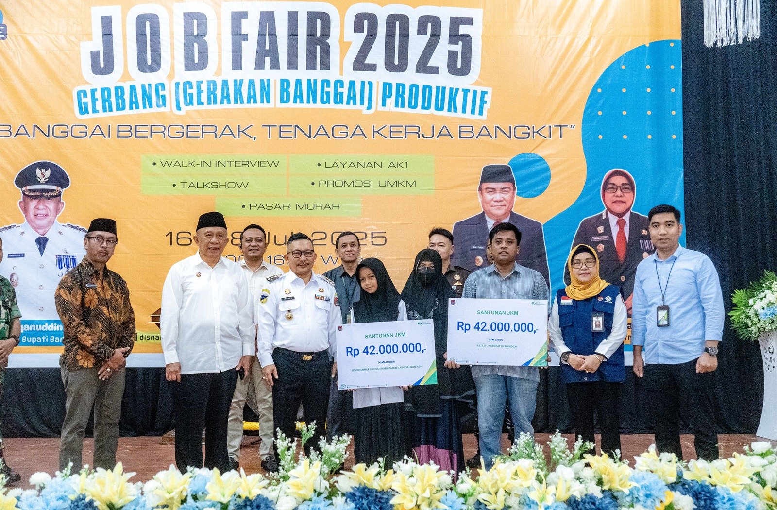 BPJS Ketenagakerjaan Cabang Banggai Luwuk, salurkan santunan kematian sebesar Rp.84.000.000 kepada dua orang ahli waris penerima manfaat BPJS Ketenagakerjaan, dengan masing-masing menerima manfaat sebesar Rp.42.000.000. Penyerahan tersebut dilakukan dalam rangkaian kegiatan Job Fair Gerbang (Gerakan Banggai) Produktif bertajuk “Banggai Bergerak, Tenaga Kerja Bangkit” yang dilaksanakan Dinas Tenaga Kerja dan Transmigrasi Kabupaten Banggai di Gedung Dongkalan Kelurahan Luwuk, Kecamatan Luwuk, pada Rabu (16/07/2025).