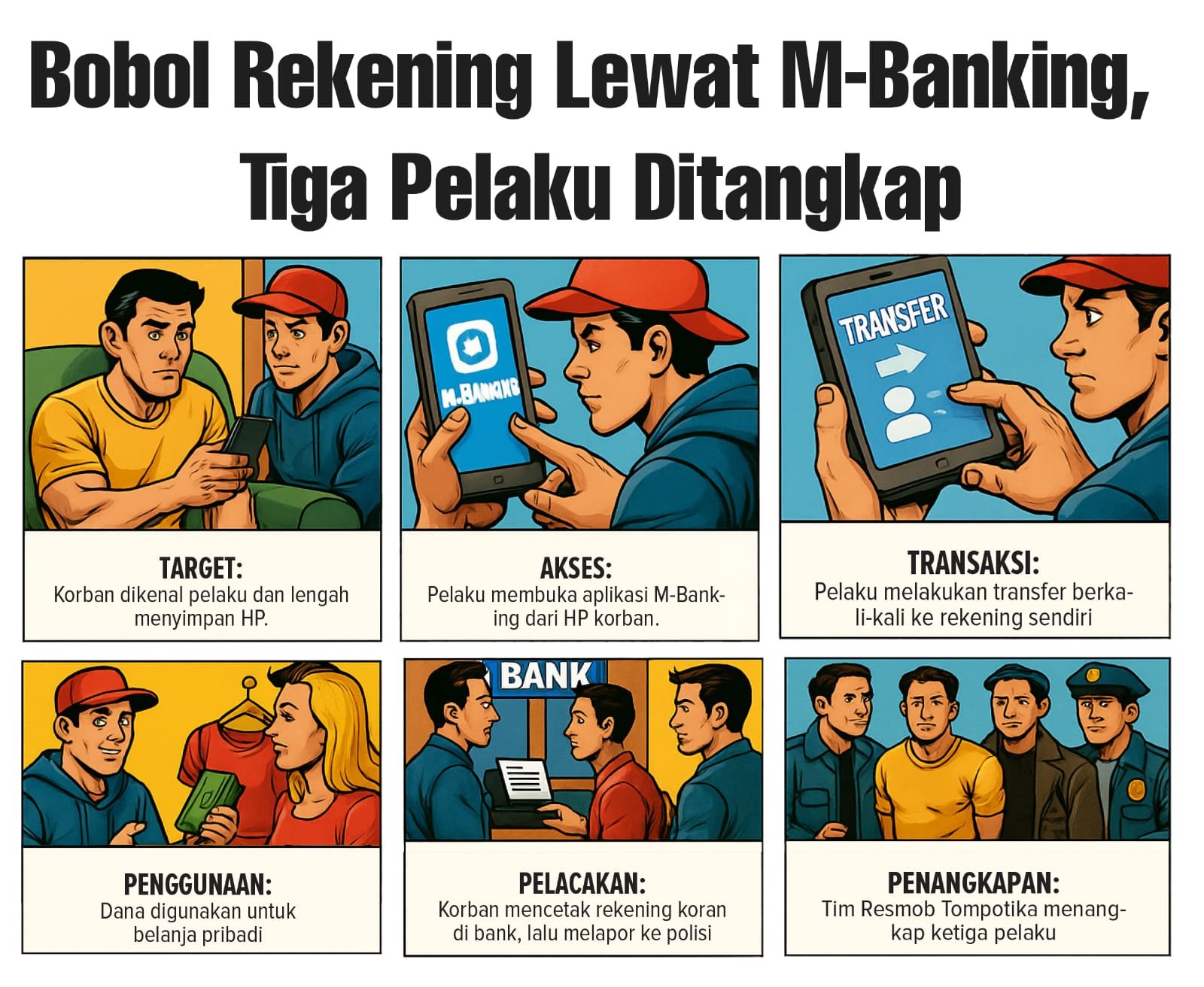 Tim Resmob Tompotika Polres Banggai berhasil mengamankan tiga pelaku pembobolan saldo rekening yang mencuri uang hingga puluhan juta melalui M-Banking di handphone (HP) milik korban.