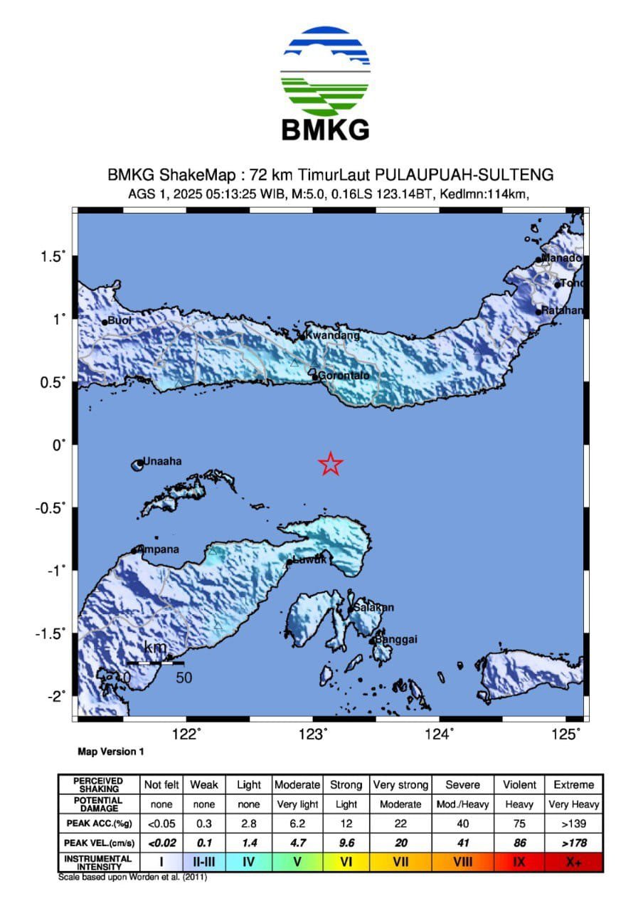 Gempa bumi tektonik berkekuatan magnitudo 5,0 mengguncang wilayah Banggai, Sulawesi Tengah, pada Jumat pagi, 1 Agustus 2025. Badan Meteorologi, Klimatologi, dan Geofisika (BMKG) memastikan gempa ini tidak berpotensi tsunami.