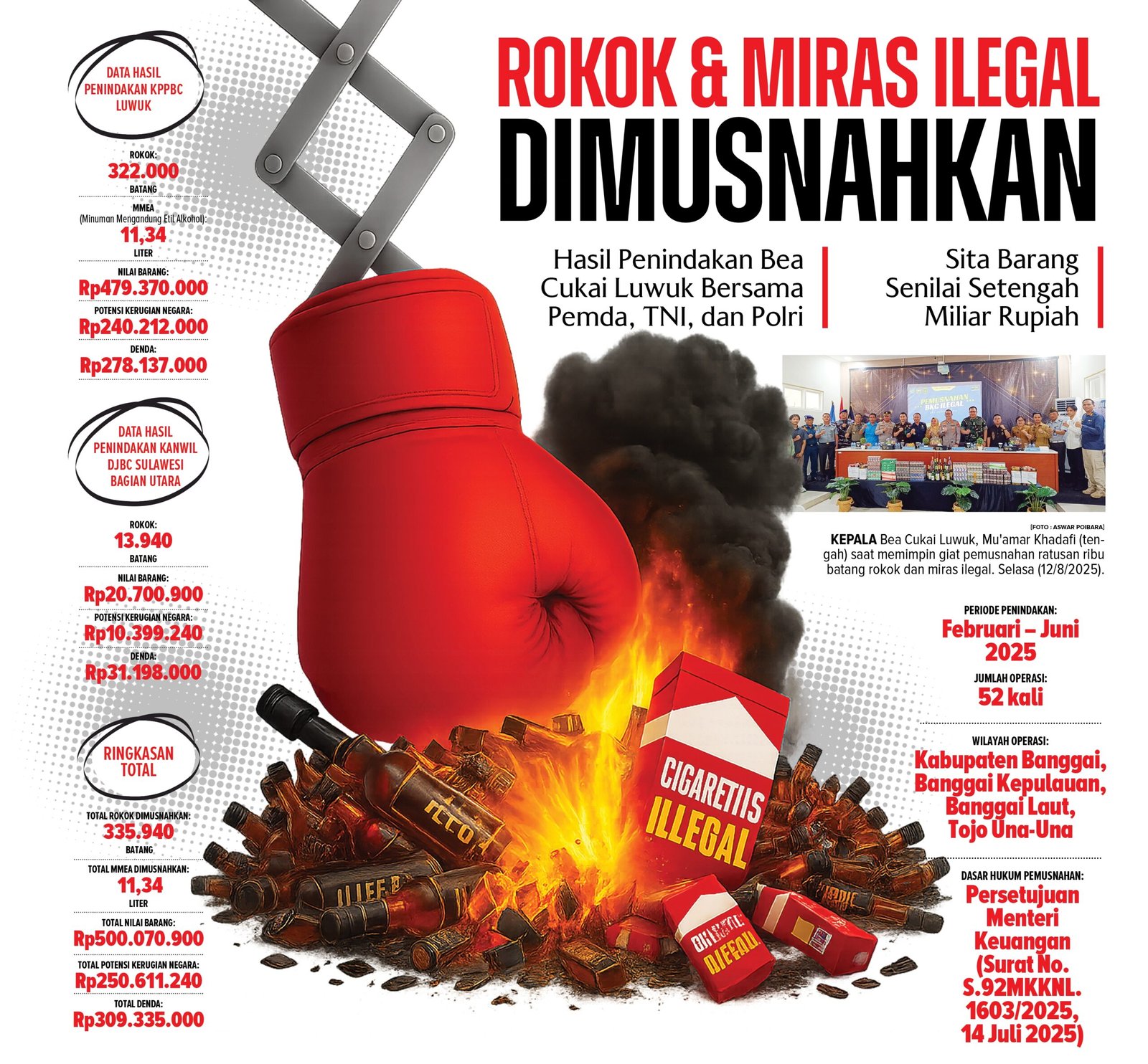 Dari hasil penindakan KPPBC Luwuk, dimusnahkan 322.000 batang rokok dan 11,34 liter minuman mengandung etil alkohol (MMEA). Total nilai barang tersebut mencapai Rp479.370.000 dengan potensi kerugian negara sebesar Rp240.212.000. Penindakan itu juga menghasilkan denda senilai Rp278.137.000.