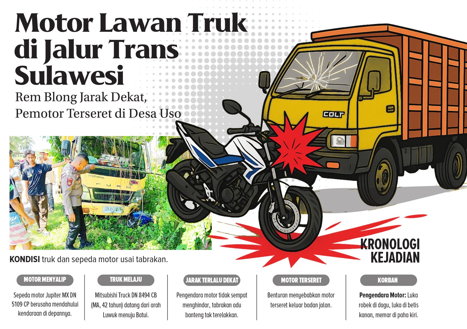 Kecelakaan lalu lintas kembali terjadi di ruas Jalan Trans Sulawesi, tepatnya di Desa Uso, Kecamatan Batui, Kabupaten Banggai, Rabu (13/8/2025) sekitar pukul 13.00 Wita. Sebuah sepeda motor dan truk terlibat tabrakan adu banteng yang mengakibatkan pengendara motor mengalami luka serius.