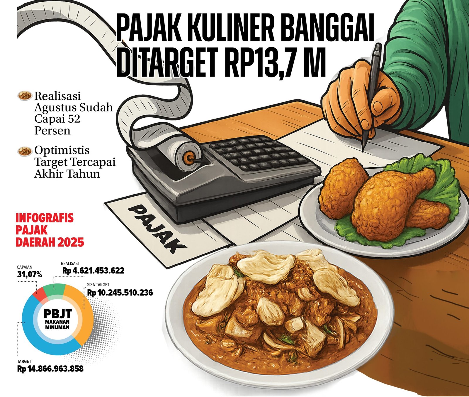 Badan Pendapatan Daerah (Bapenda) Kabupaten Banggai menargetkan pendapatan dari sektor Pajak Barang dan Jasa Tertentu (PBJT) makanan dan minuman mencapai Rp13,7 miliar pada tahun 2025. Hingga Selasa (19/8), realisasi pendapatan dari sektor ini telah mencapai Rp7.156.944.778, atau sekitar 52,17 persen dari target.