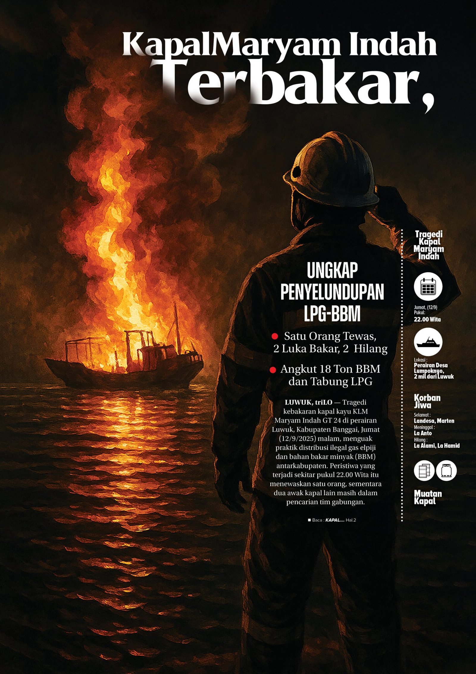 Tragedi kebakaran kapal kayu KLM Maryam Indah GT 24 di perairan Luwuk, Kabupaten Banggai, Jumat (12/9/2025) malam, menguak praktik distribusi ilegal gas elpiji dan bahan bakar minyak (BBM) antarkabupaten. Peristiwa yang terjadi sekitar pukul 22.00 Wita itu menewaskan satu orang, sementara dua awak kapal lain masih dalam pencarian tim gabungan.